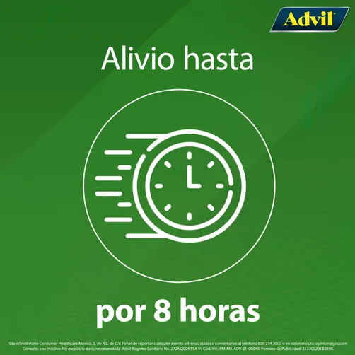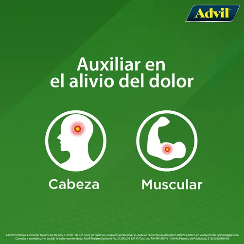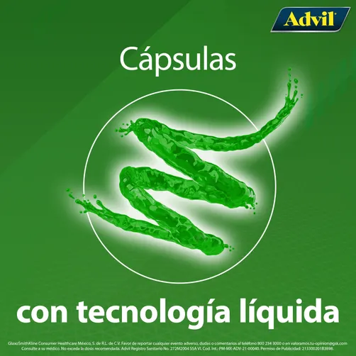 Caja con 20 cápsulas. La tecnología líquida de Advil, contenida en una sóla cápsula provee un rápido alivio de los dolores moderados a fuertes con efectiva y rápida acción. Alivia el dolor de cabeza, por migraña, dolores leves de osteoartritis, originados por cólicos menstruales, de espalda, asociados al resfriado común, de articulaciones, musculares, dentales y reduce la fiebre.