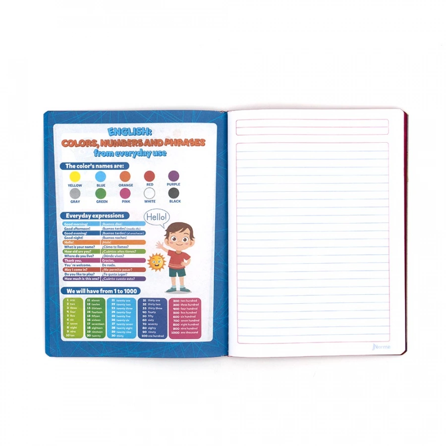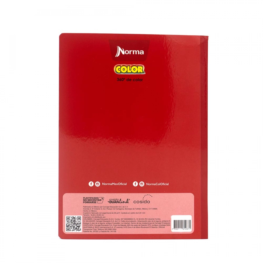 Cuaderno cosido marca Norma Color 360 cuenta con 100 hojas con tapa flexible, tamaño: college, rayado: raya. Ideal para el nivel de escolaridad: Primaria. Su carátula es Rojo la cual es plastificada, sus bordes tienen el color de la carátula para que el niño pueda identificar la materia más fácil y las hojas tienen un margen rojo completo el rayado es color azul. Además de tener insertos diferentes los cuales varían en los cuadernos. Alto: 1 cm, Ancho: 19 cm, Largo: 24.8 cm, Peso: 308 gr.